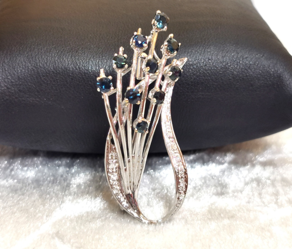Spilla anni '50 in oro bianco 18 kt con zaffiri e diamanti