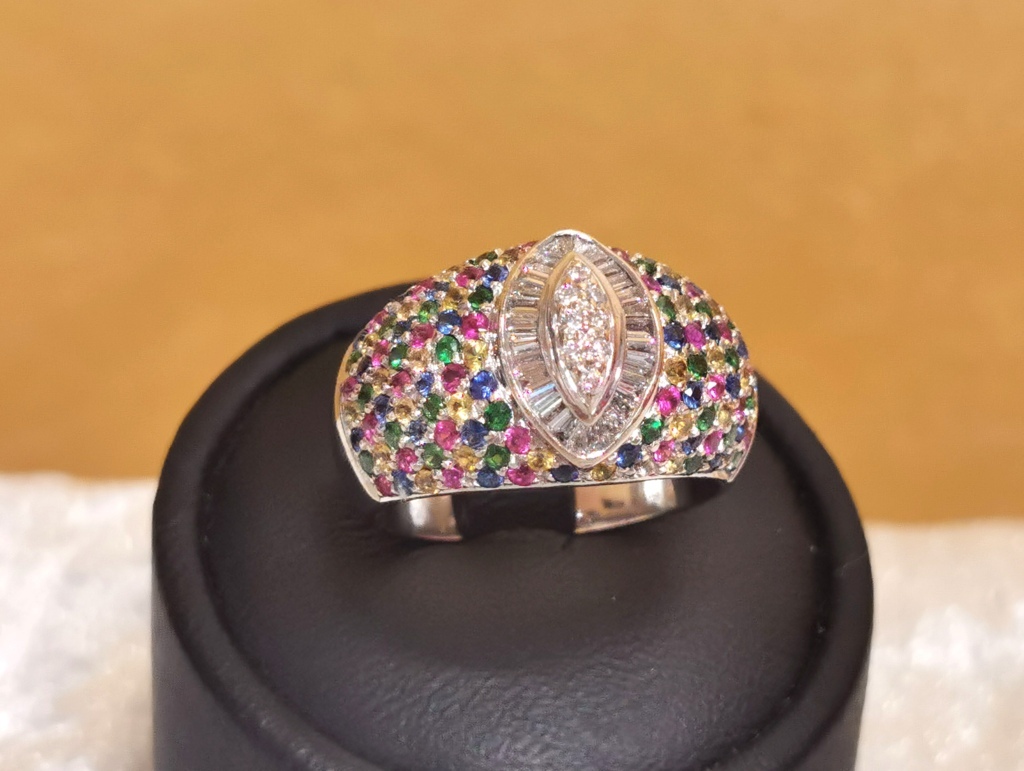 Anello oro bianco 18 kt con diamanti e zaffiri colorati