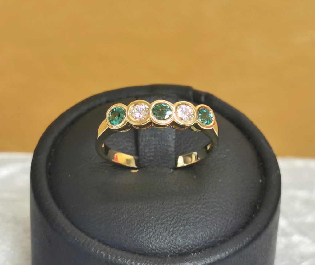 Anello veretta oro 18 kt con diamanti e pietra verde sintetica